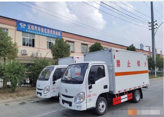 厢体配置:严格按照公告尺寸制作,外板采用1mm厚冷轧板有一次性成型的百叶窗,内饰为导电性能良好的铝板有透气孔,内衬为矩形管骨架牢靠稳定,内部填充为透气防潮阻燃的挤塑板,四种材料经现代工艺复合而成,厢体外部上下铝合金型材包边,底板和车厢前下部铺橡胶皮,后门双开,右侧中部单开门,雾报警器和门防盗报警器,严格按照国家危险品相关法规张贴。